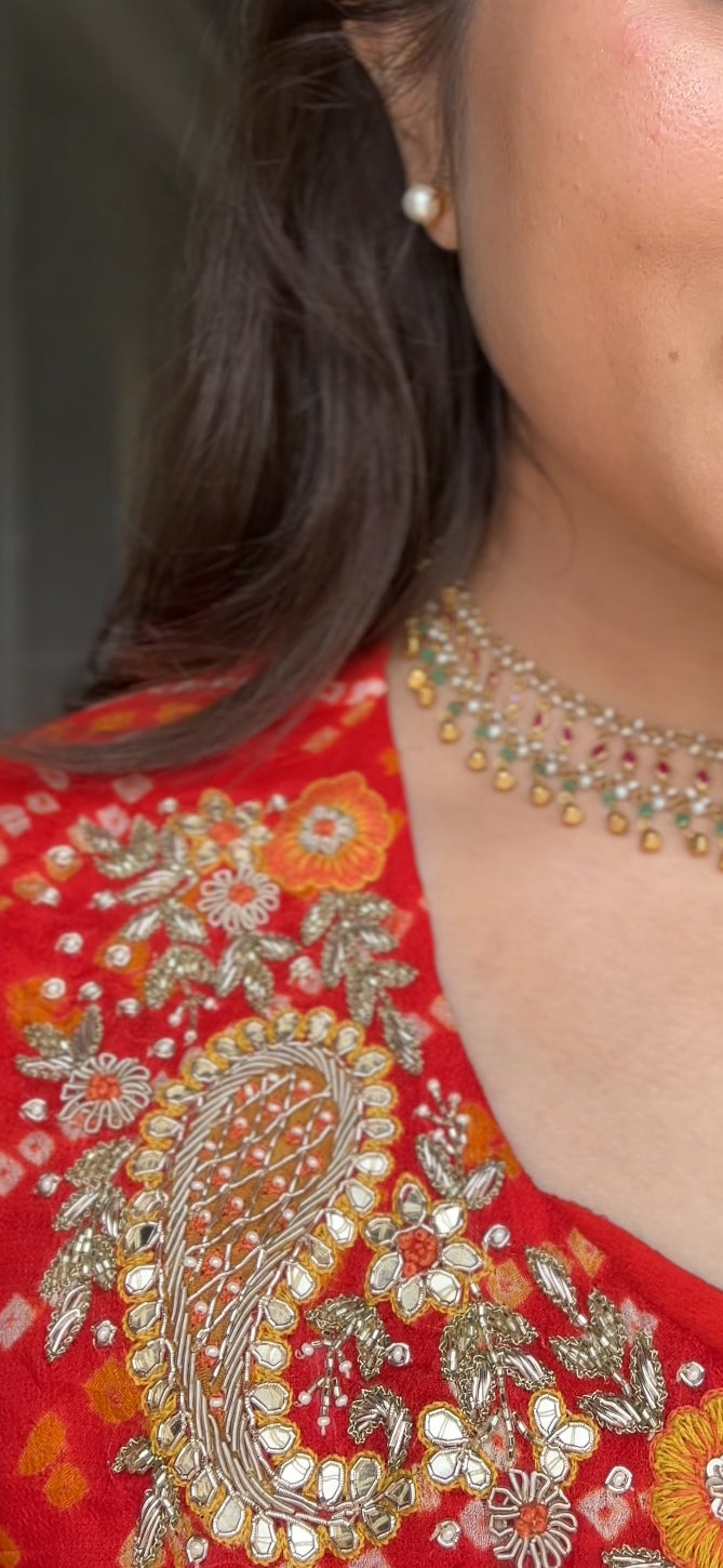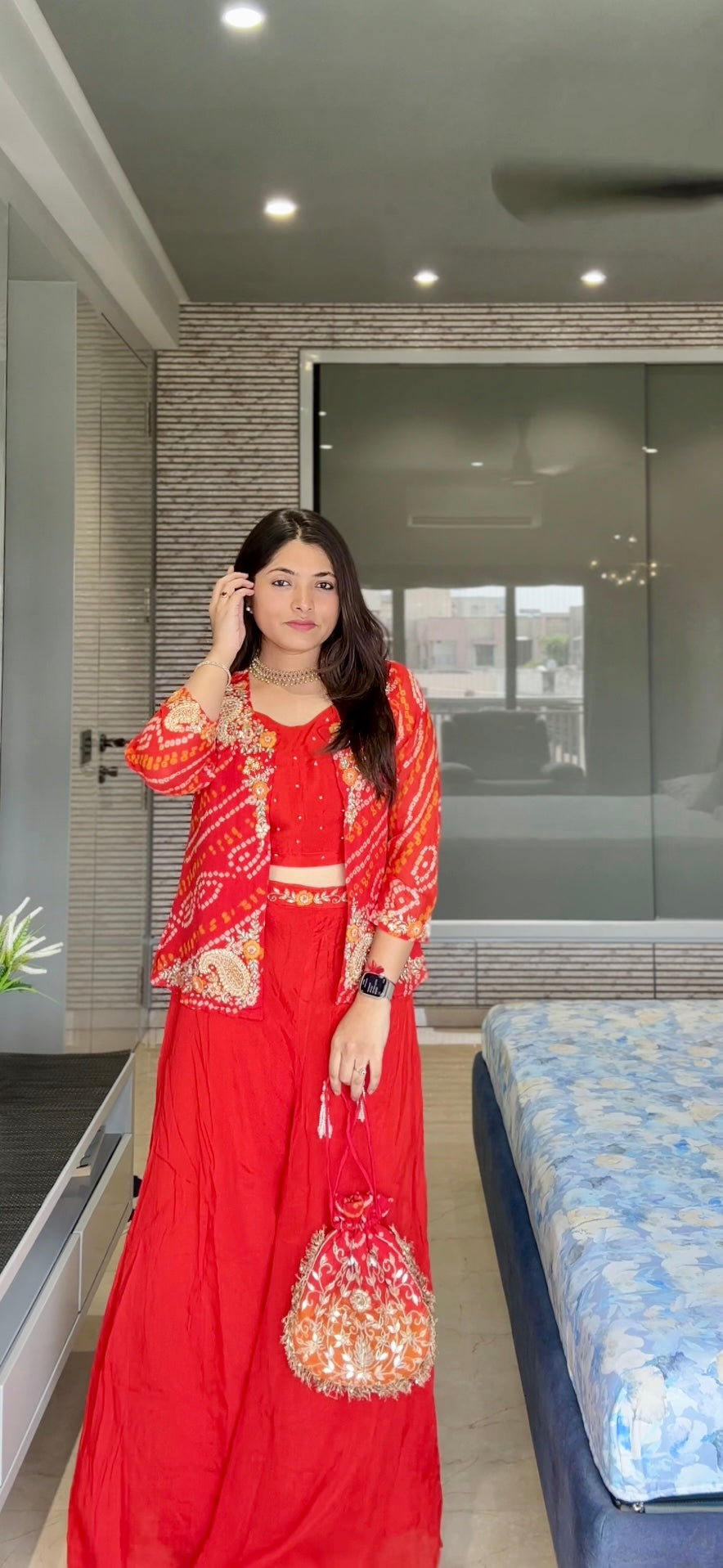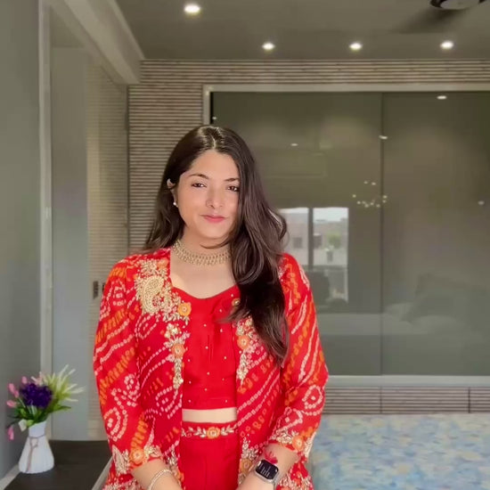 Our Bandej indowestern is the perfect fusion of traditional and modern design. Handcrafted with intricate details, this three-piece ensemble features a rust orange jacket, inner plazo, and handwork. Elevate your style with this unique and elegant piece.